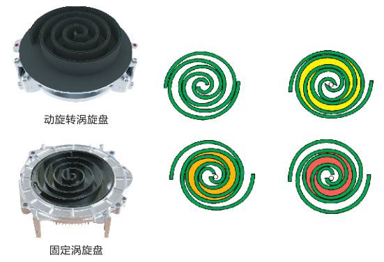 無油渦旋空氣壓縮機(jī)靜渦盤與動(dòng)渦盤在一定的相位保持下小半徑的平面運(yùn)動(dòng),動(dòng)靜渦盤嚙合形成若干對(duì)月牙形封閉的壓縮腔,吸入工作腔的氣體被隨后形成的月牙形的壓縮腔逐漸壓縮,然后又靜盤中心部位排氣口排出。
