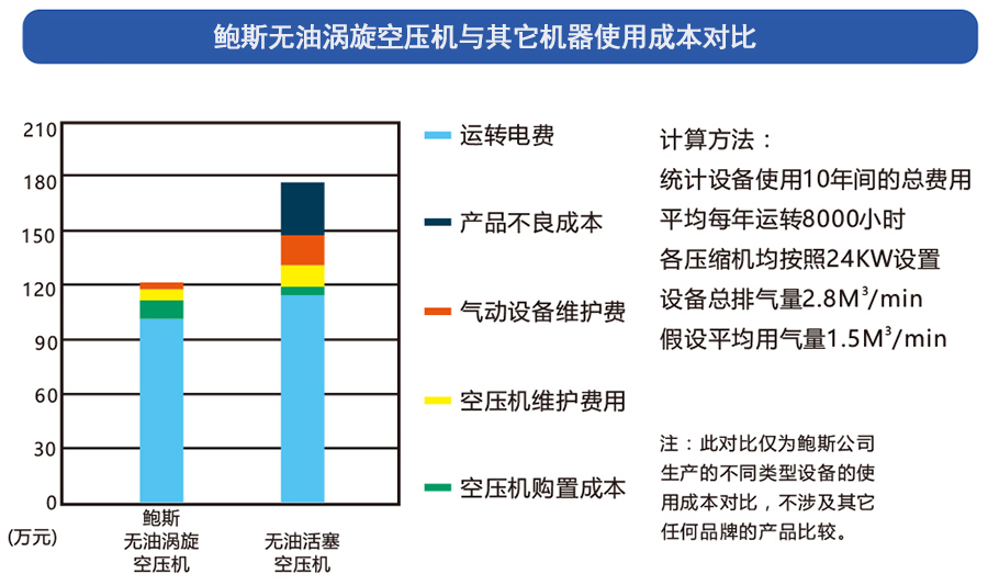 鮑斯無油渦旋空壓機(jī)使用成本比以往類型機(jī)器有極大的改觀。
